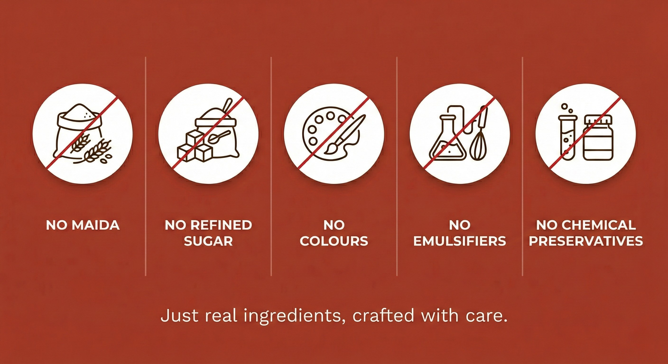 Yes! All our products are naturally gluten-free, without compromising on taste or texture. We use gluten-free flours like jowar (sorghum), chickpea flour, oat flour, and coconut flour instead of maida (white flour).