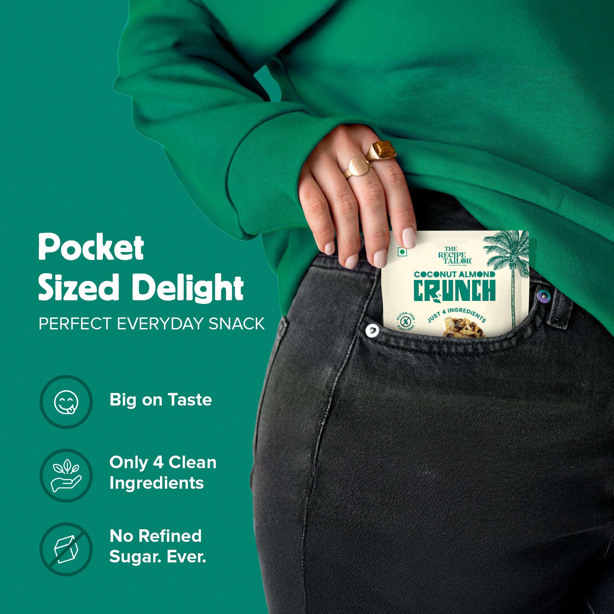 Made with California almonds, coconut flour, organic coconut sugar, and dark chocolate chips. This clean, crunchy snack is as pure as it is delicious. No maida, no refined sugar, no additives. Just simple ingredients, baked into light, crispy clusters you’ll keep coming back to.